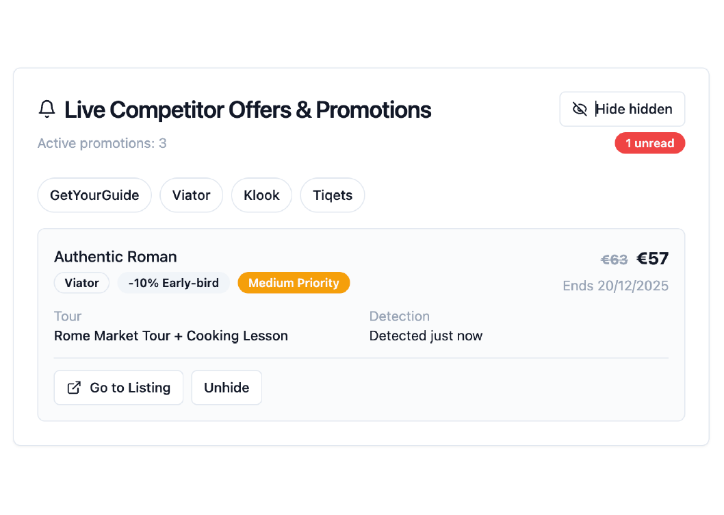 See when rivals change prices, launch offers, or sell out and react before it costs you bookings.