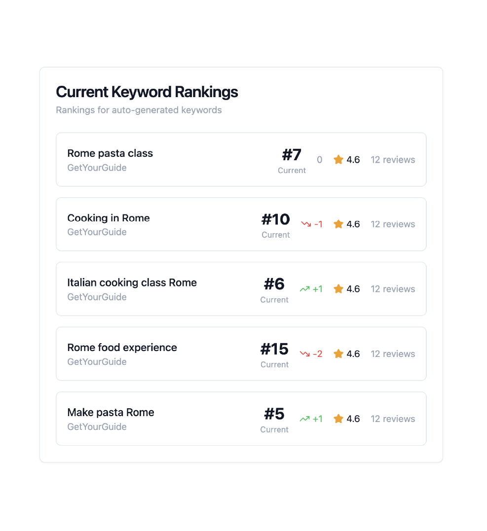 Track where you appear in OTA searches by tour, category, city, and keyword searches.
